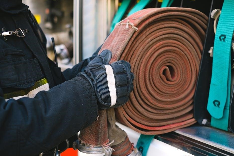 Crucially‚ the hose must meet specific discharge rate requirements‚ delivering a minimum of 0.45L/S at 220-10kPa. This ensures sufficient water volume and pressure are available for effective fire suppression. The hose length is designed to provide a 36m reach‚ allowing firefighters to access and combat Class A fires safely.